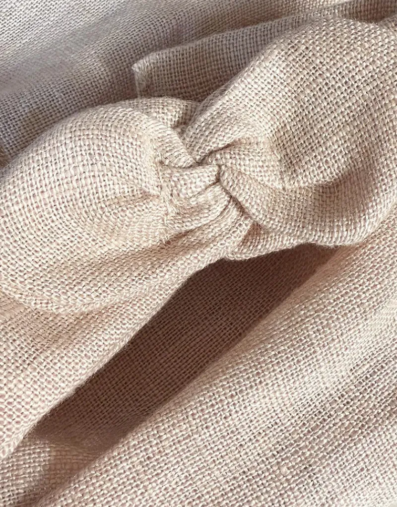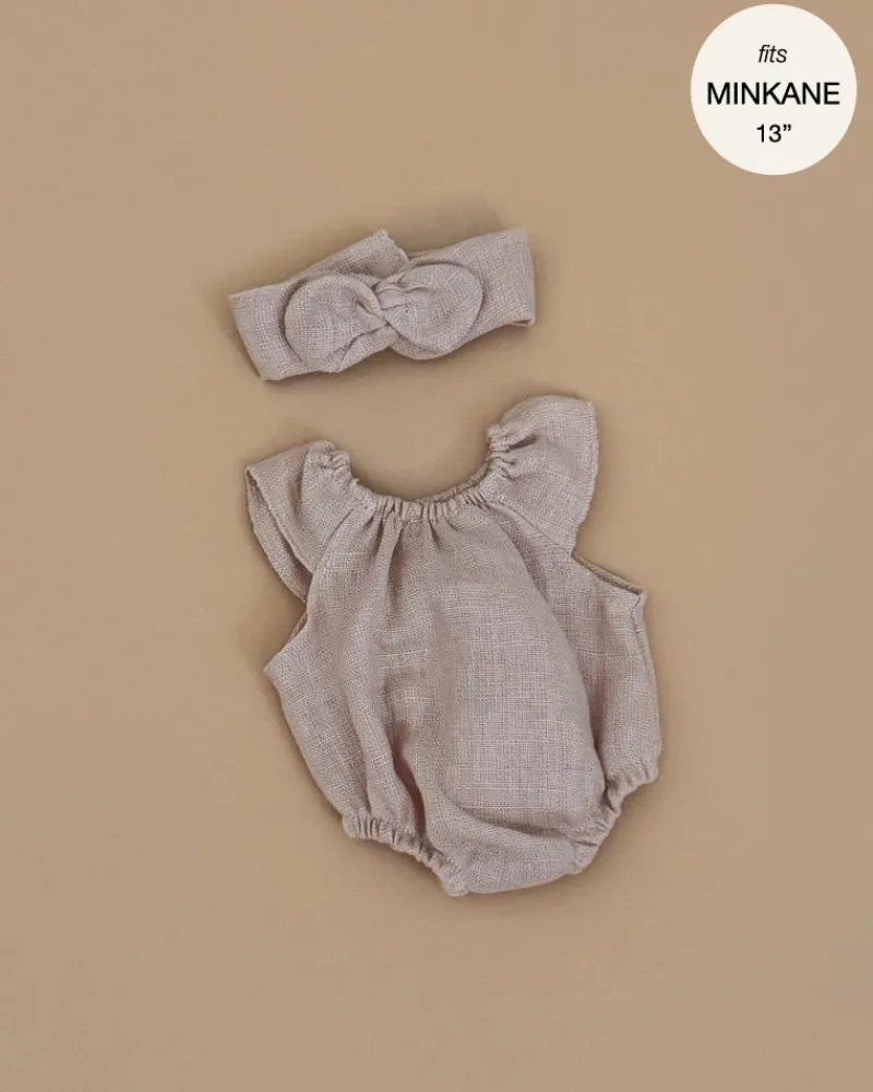 Clara romper and headband with round bow in washed linen for Minikane Gordis 13in & 14in dolls.