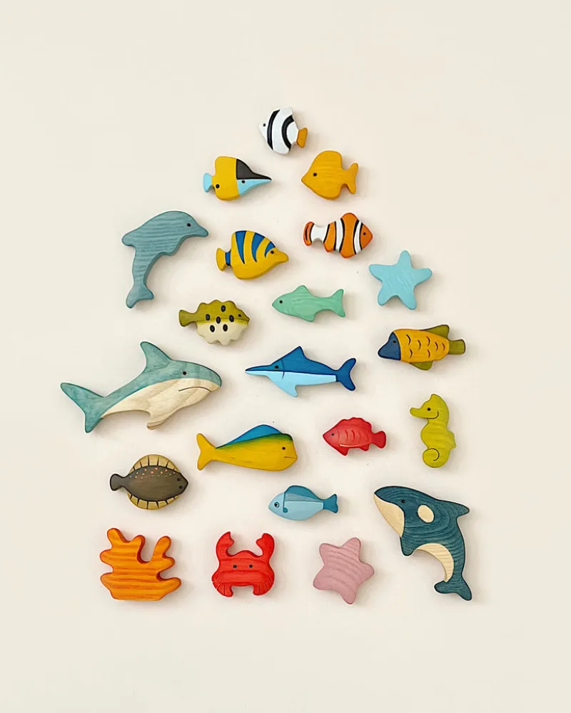 This set includes 21 fish and sea creatures. Created from solid birch and ash wood and painted with non-toxic, water based paint. Dimension vary from approximately 1″ – 3″.