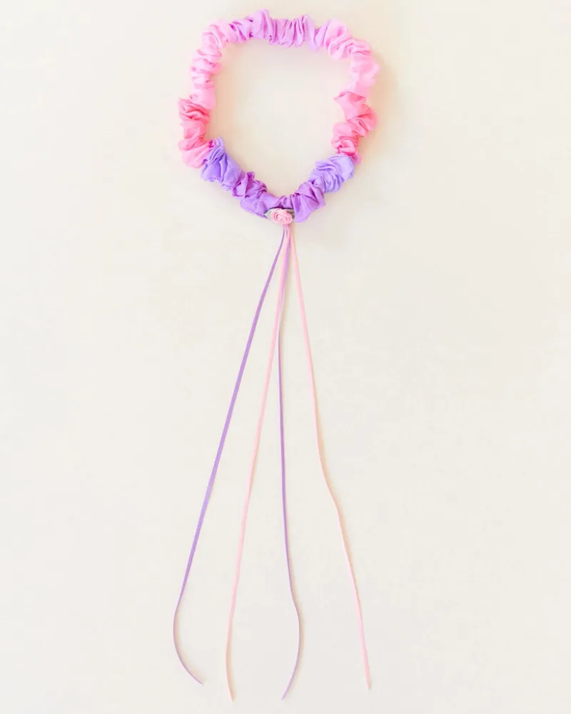 Garlands are finished with a satin rose and four flowing ribbons, Garlands can be worn simply on the head or waist