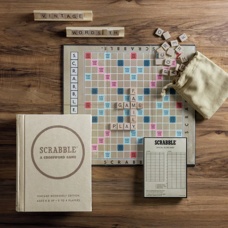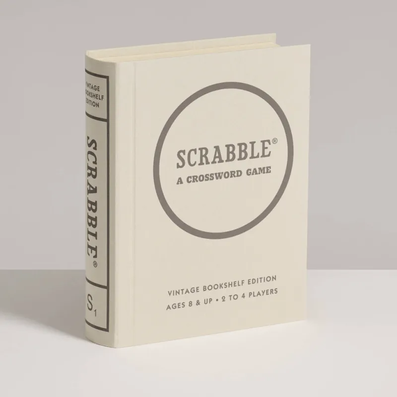 This Vintage Bookshelf Edition of SCRABBLE was inspired by the graphics of the original 1948 game. The designers have created an elegant storage method that allows you to store this game and its components on your bookshelf among the classics. The addition of premium game components create a classic to be enjoyed for generations.The game box is a fabric-wrapped book with integrated storage. A slipcase covers and protects the game box. Inside you’ll find a vintage game board with graphics inspired by the 1948 edition and the following accessories: 100 wood letter tiles, 4 tile racks, fabric tile pouch, score pad, pencil, and instructions.Bookshelf case weighs 36 oz and Measures: 10.625 x 8.375 x 2.63 inches Game board measures 15.25 x 14 x .125 inches when unfolded for gameplay, 7 x 5.25 x 0.50 inches when folded for storage Letter tiles measure 0.75 x .6875 inches.Keywords: Birthday Gift, Grocer, General Store, Birthday Gift, Mother’s Day Gift, Christmas Gift, Fall Decor