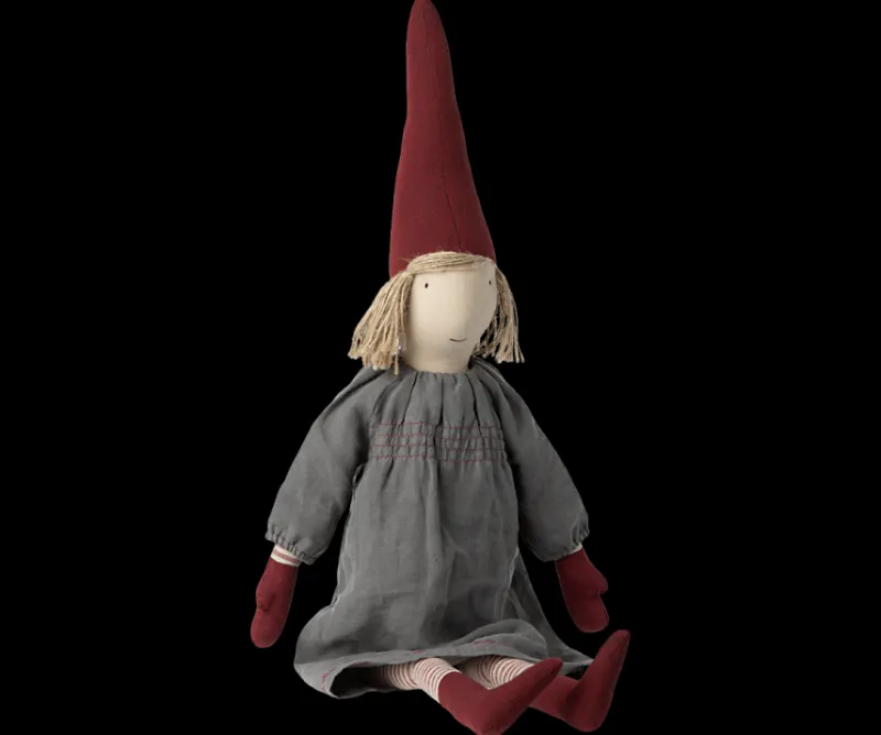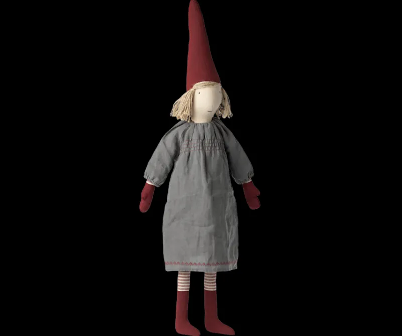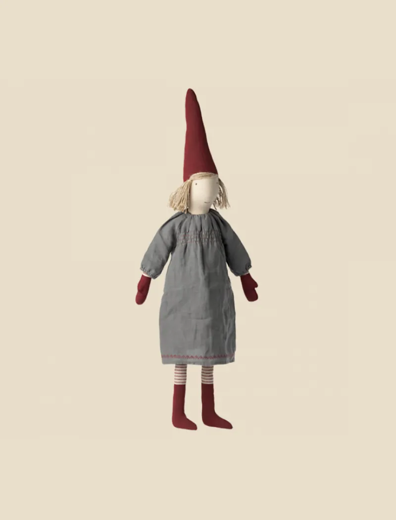 This pixy in size small is wearing beautiful clothing.