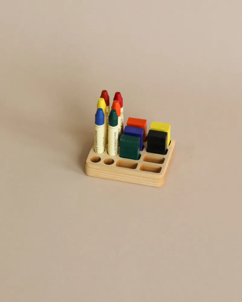 This crayon holder is designed specifically for Stockmar sticks and includes 8 slots for sticks and 8 slots for blocks.
