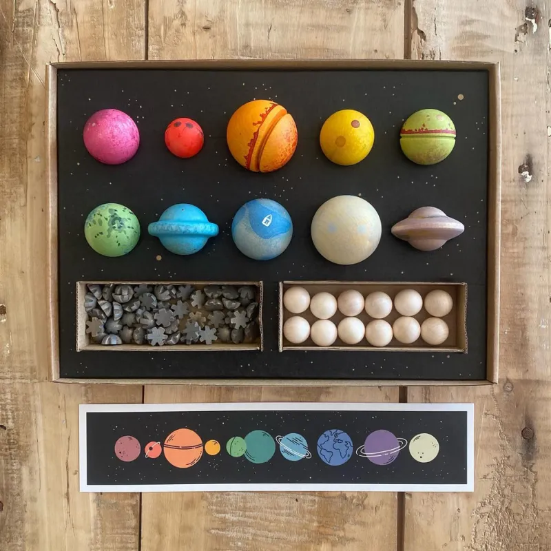 Explore the outer space with Grapat’s planets. Besides being objects for open-ended play, the planets also work as a perfect addition to their weekly calendar. As the days of the week were originally named after planets, you can match them all. Dear Universe contains more than 40 wooden pieces.