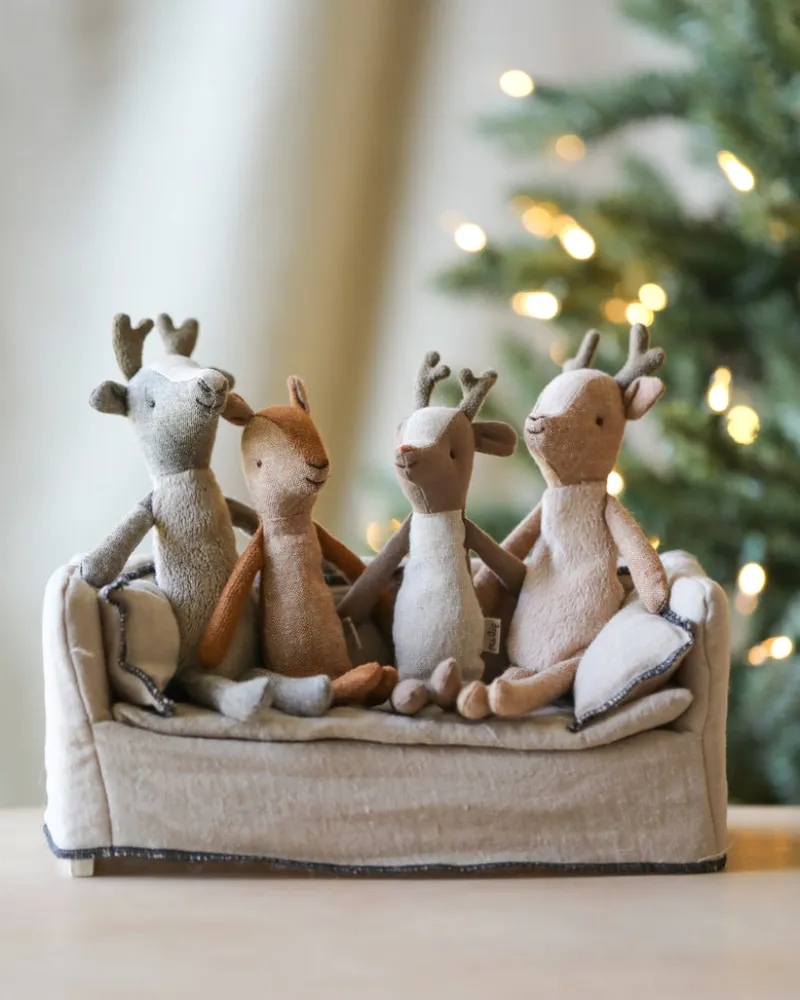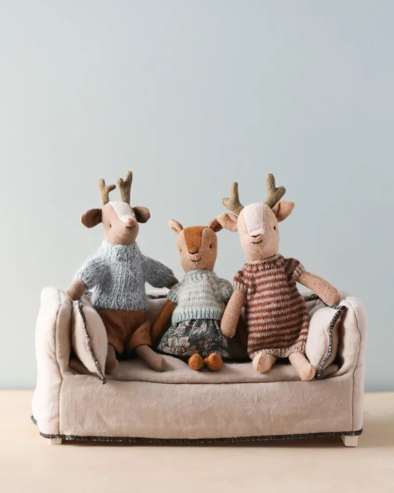 A sweet and adorable deer father. Deer father is the tallest in the family and he has a very soft, furry belly. His tail is fuzzy like the rest of the family’s, and his antlers are nice and soft faux suede.