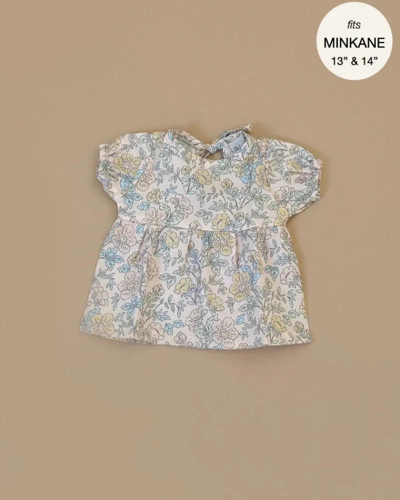 Faustine dress with short sleeves and round double gauze crush with pouch for Minikane Babies 13″-14″ dolls.