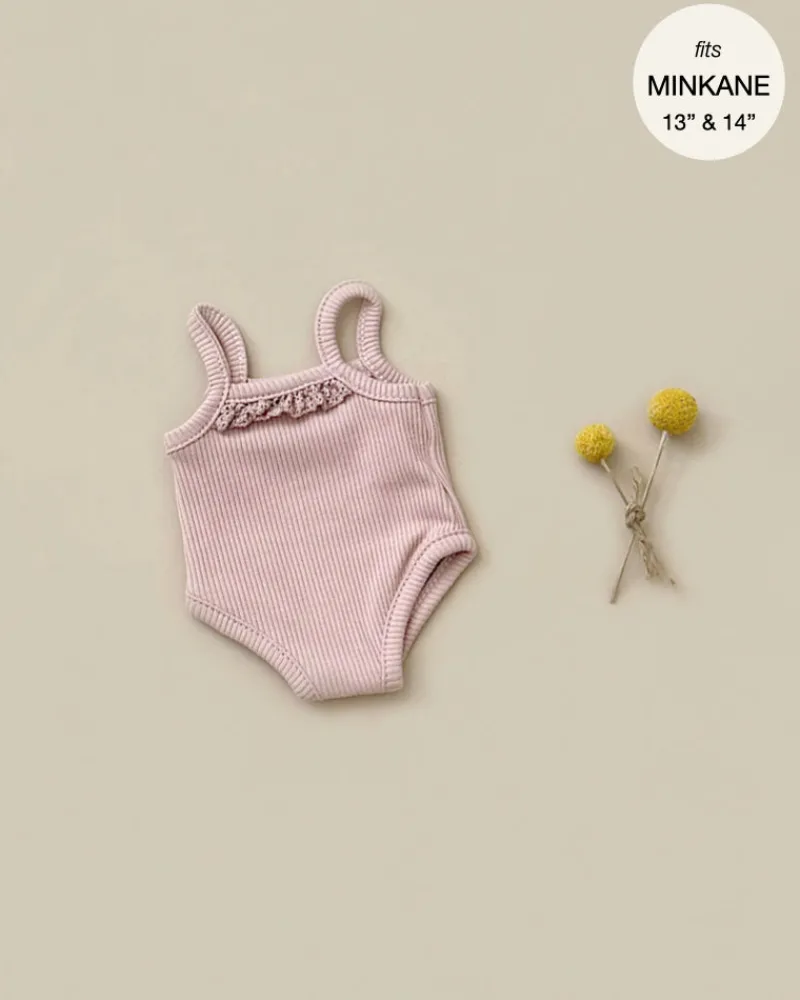 Les P’tits Basiques – Jumpsuit with straps in petal ribbed knit and lace. For Minikane Gordis dolls 13″.