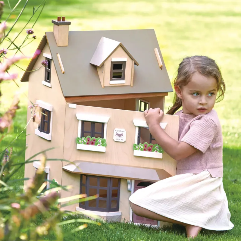 Foxtail Villa is a perfect town style dolls house. The subtle colours and top quality plywood fascia makes this a beautiful mid-size dolls house for any little girl or boy. Included is a starter set of matching furniture.