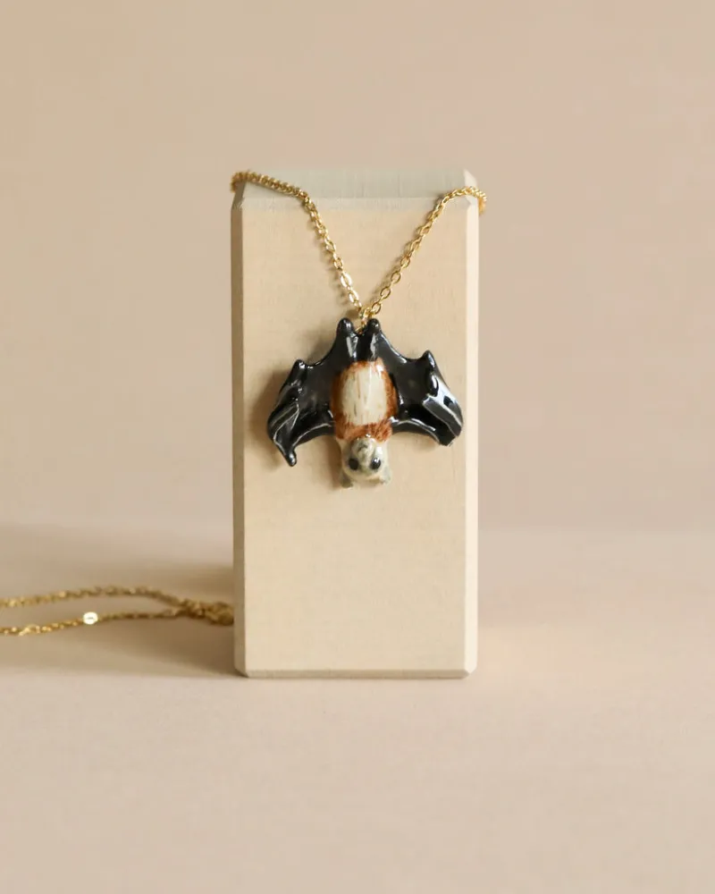 Though the fruit bat is the only mammal on Earth capable of full flight, it spends most of its time hanging upside down in caves and trees. This porcelain hand-painted charm strikes a balance between spooky and cute, perfect for the Halloween-obsessive and the nature-lover alike. Each necklace comes individually gift boxed, and ships for free! Nothin’ scary about that.