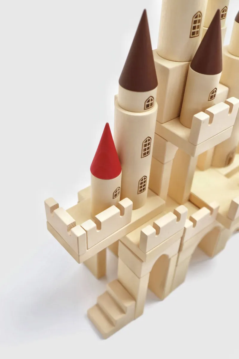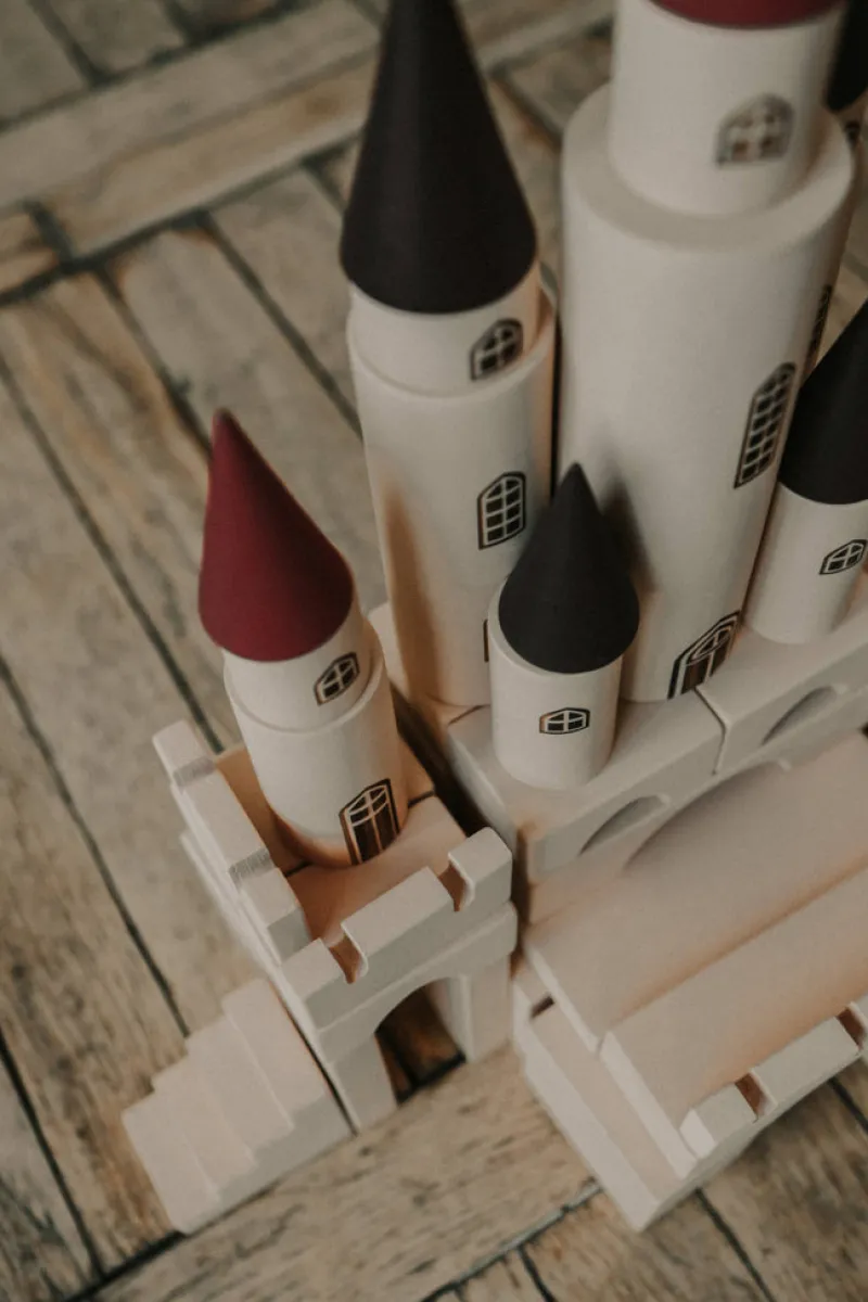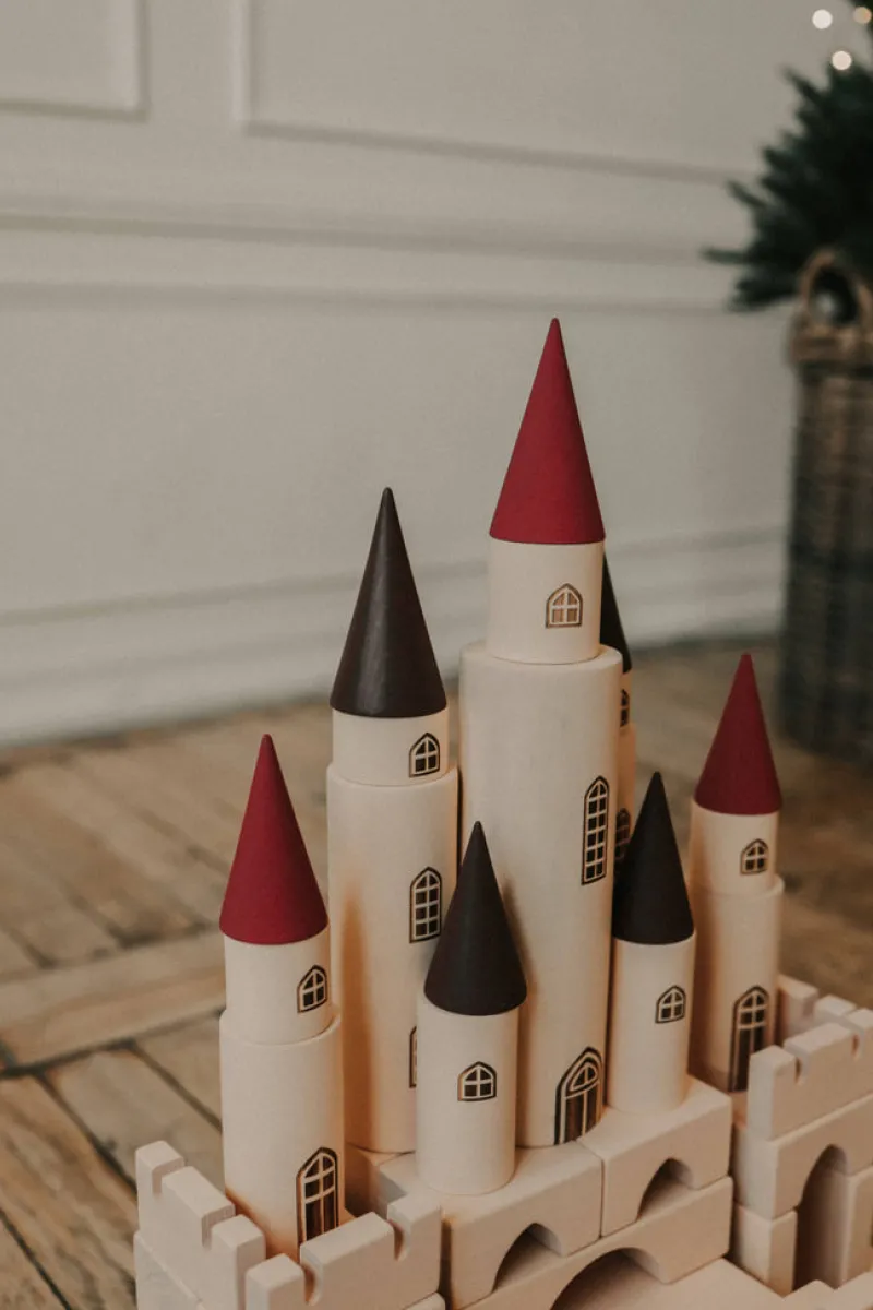 Create a magical castle with easy-to-combine parts. Each part is coated with non-toxic water-based paint in a single color, except for the unique cones. All edges are smooth and delightful to the touch. This set includes 65 pieces, including 12 cylinders of varying sizes, 7 cones in different sizes, and a variety of plates, blocks, and arches. Each cylinder features a detailed engraving of a window and/or door.