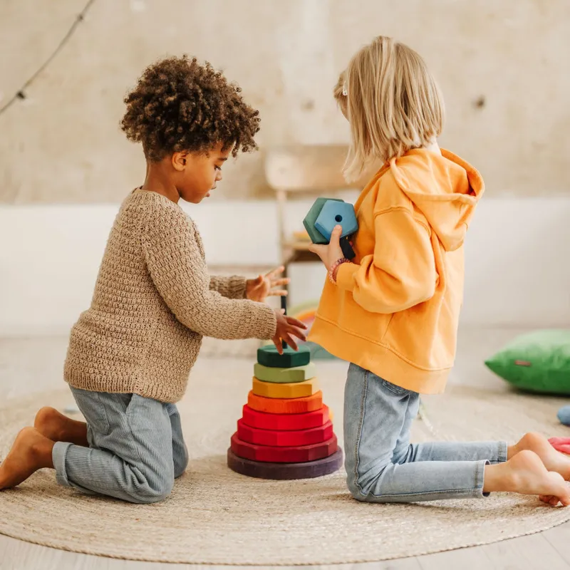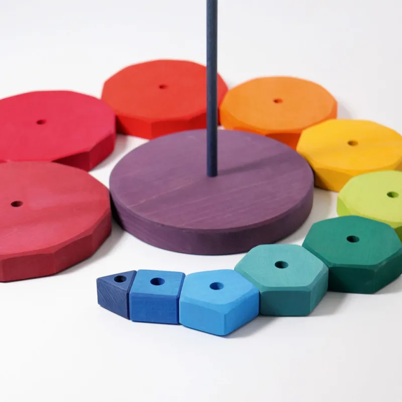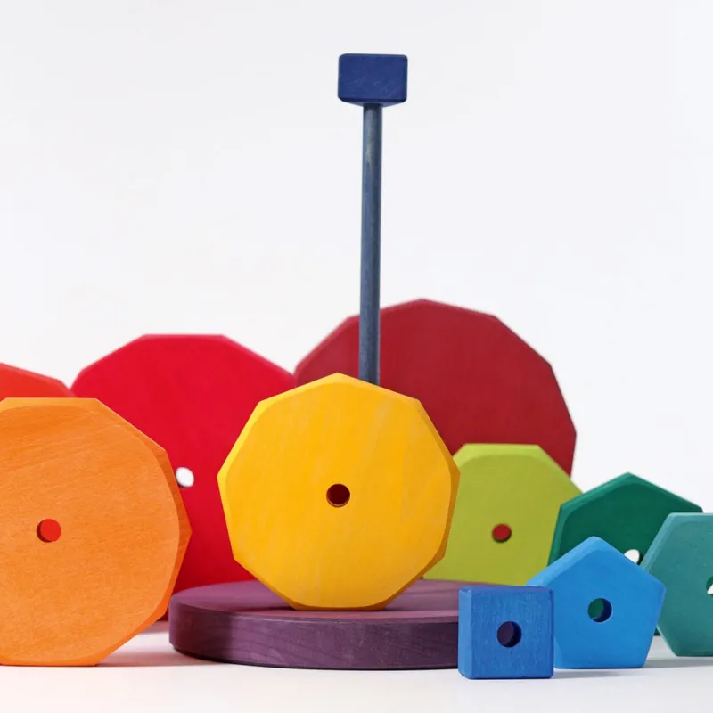 From triangle to polygon: the children can sort and stack forms and colors and build with the discs. While stacking, the eye-hand coordination is stimulated and fine motor skills are trained.