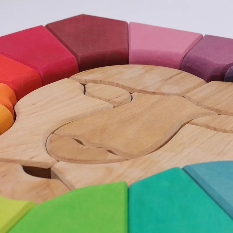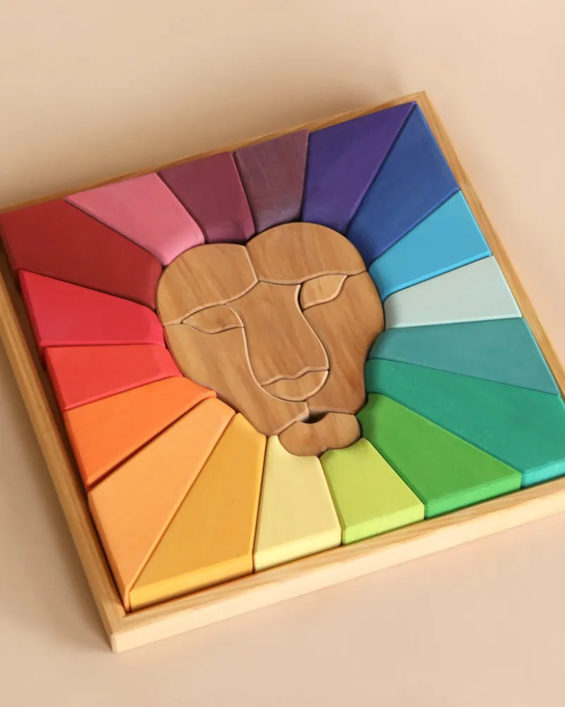 A wonderful building set in a wooden frame that combines organic shapes in oiled natural wood and colorful geometric shapes.