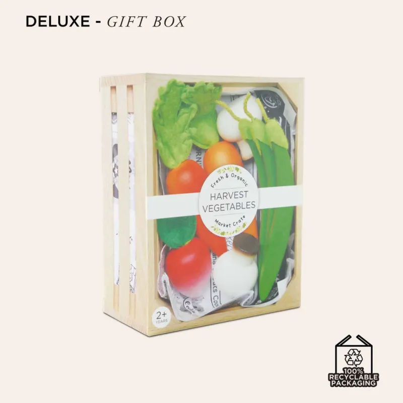 Grocery store fun awaits with this wonderful wooden role play toy for little imaginations. This tasty crate of fresh veggies comes complete with a selection of wood and fabric garden vegetables, perfect for getting your ‘5-a-day’. Teach little ones about the different food groups and healthy eating with this fantastic early-learning toy. Each play piece of this 9-piece set is perfectly sized for little hands to grasp, ideal for developing coordination and refining fine motor skills. An ideal gift and the perfect accessory to complement our range of food crates and markets.-Suitable for ages 2 years+-Made from FSC®-certified wood-Decorated with non-toxic, water-based resistant paints