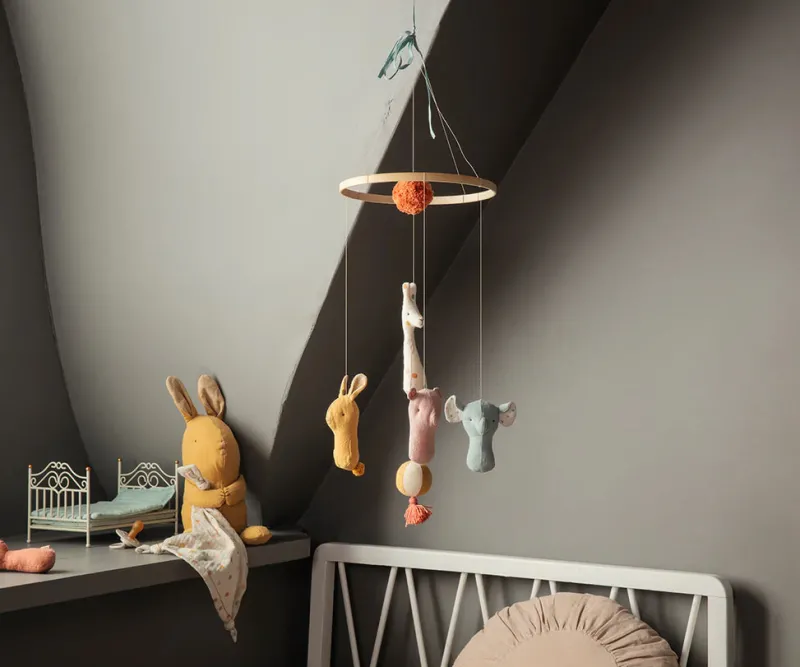 Lullaby friends is a collection of beautiful baby items. This mobile is perfect for the baby to look at from the bed or the nursery table. The animals are made in soft fabrics with unique prints and come in a beautiful gift box.