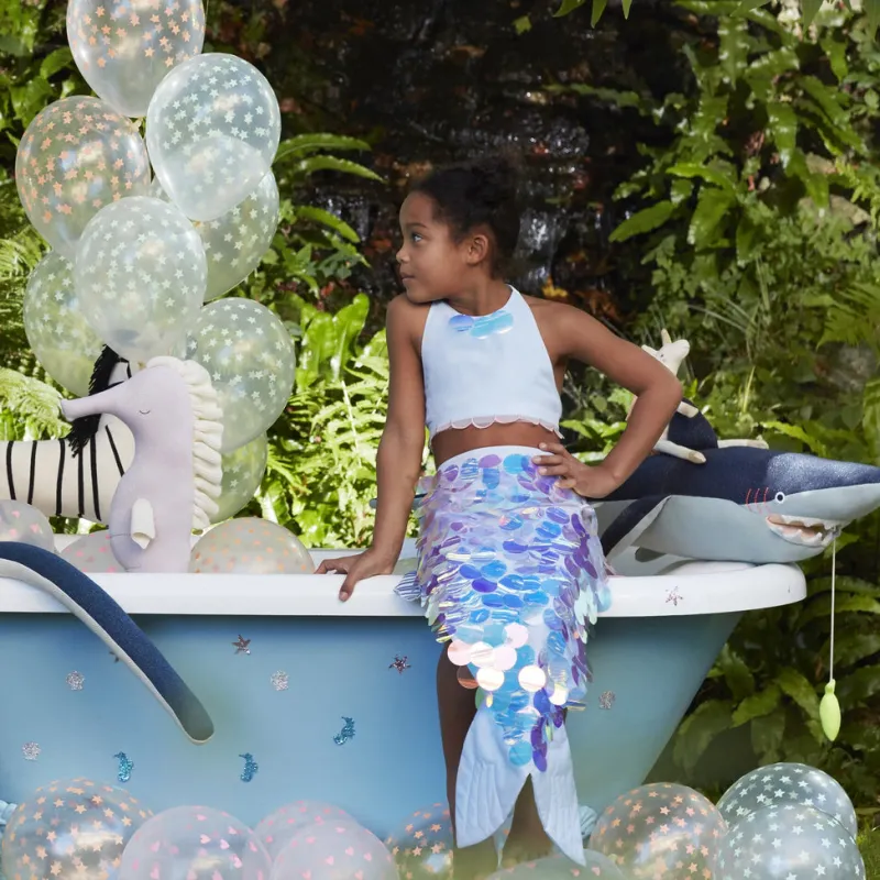 This beautiful mermaid dress-up kit will transform your little one into a gorgeous sea maiden. Featuring a crop top and a wrap with tail detail. Iridescent sequins on the top and wrap give a sensational shimmering effect. Perfect for hours of imaginative play.