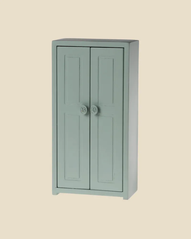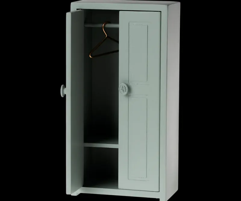 A small closet helps the mice family organize their wardrobe. The closet comes with three golden hangers.