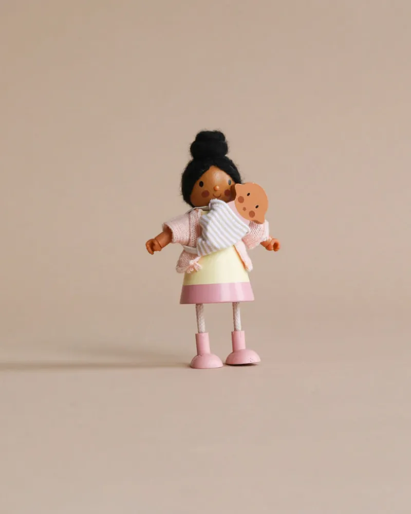 Mrs. Forrester has got a gorgeous new baby! Made from solid wood with pretty knitted and jersey fabrics. Scaled for wooden dolls houses.