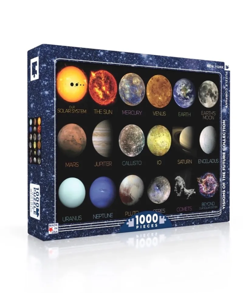 NASA Space Travel Poster. 1000 Piece Jigsaw Puzzle. Finished Puzzle Size: 26.625 x 19.25″. Linen Style Finish to reduce glare. Made in USA. Recommended Age: 13+ Years.