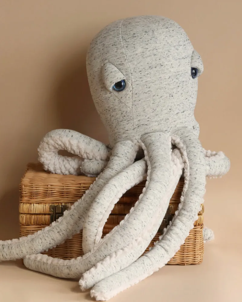 With its big soft eyes, long fluffy tentacles, and pastel shades, our famous octopus soft toy will open the door to an underwater world universe full of poetry and mystery for young and old alike. A team of seamstresses have put their hearts into making this octopus soft toy straight from the seabed, using needles, fabric, and a little magic! This toy will gracefully guide your little one through the depths of a silent, strangely reassuring universe. Your child can take this new friend, with his protective, benevolent eye and long, soft arms on all their craziest adventures.