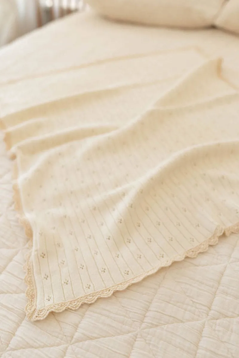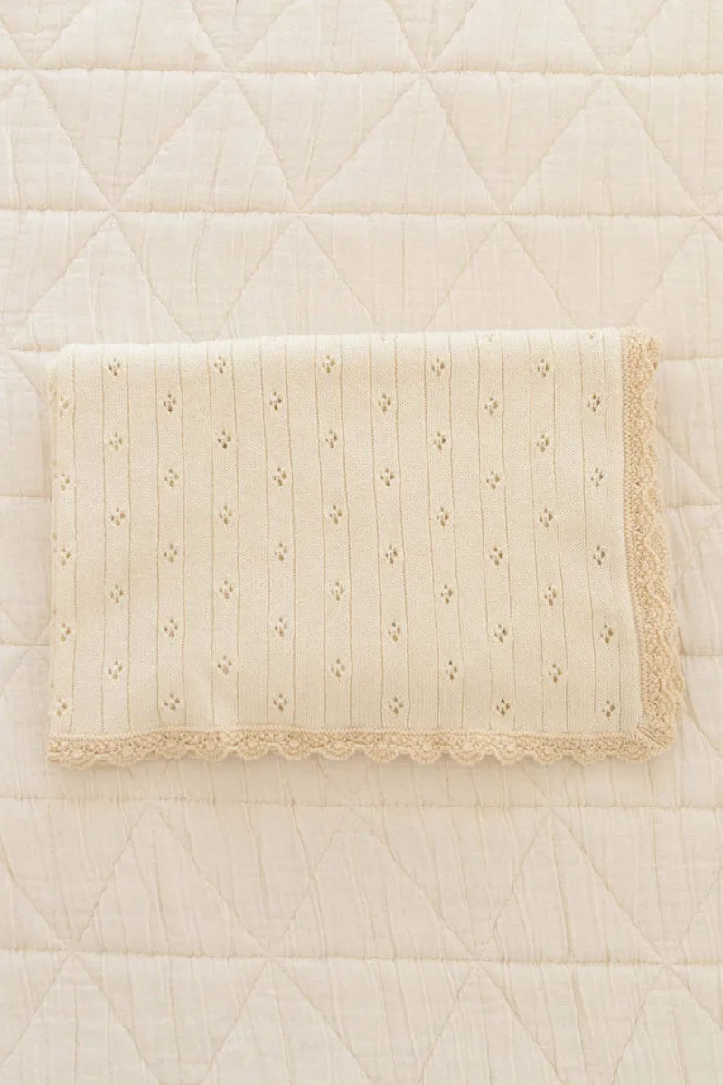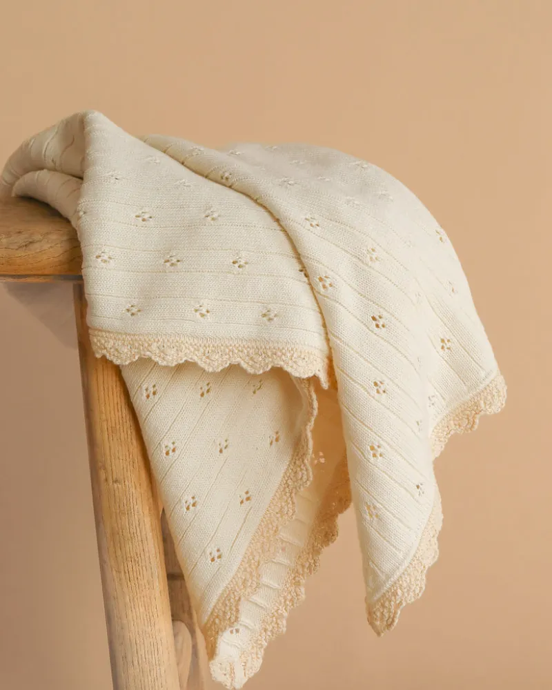 This baby blanket is made from 100% certified organic pointelle cotton knit.