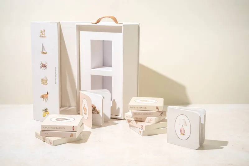 Jump-start baby’s exposure to first words using this beautifully designed board book box set—the perfect gift for newborns and baby showers! Now in a mini size that’s great for their small hands!Designed by a professional watercolor artist and licensed speech therapist, Our Very Little Library Board Book Set includes 10 board books that feature charming watercolor illustrations and foundational first words that will help you build your child’s vocabulary. The durable materials and extra-small book size—each book measures just 2.75″ x 2.75″—also make them perfect for your baby’s little hands. Plus, the adorable bookshelf-inspired carrying case is perfect for storing the books or on-the-go reading!Our Very Little Library Board Book Set includes 10 board books that feature foundational words in the following categories:Farm AnimalsForest AnimalsOcean AnimalsSafari AnimalsFruits and VeggiesToysTransportationCategories: kids books