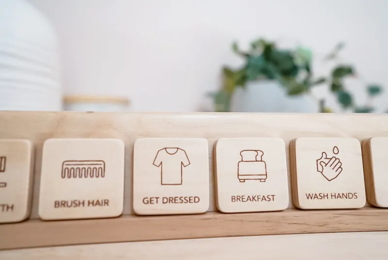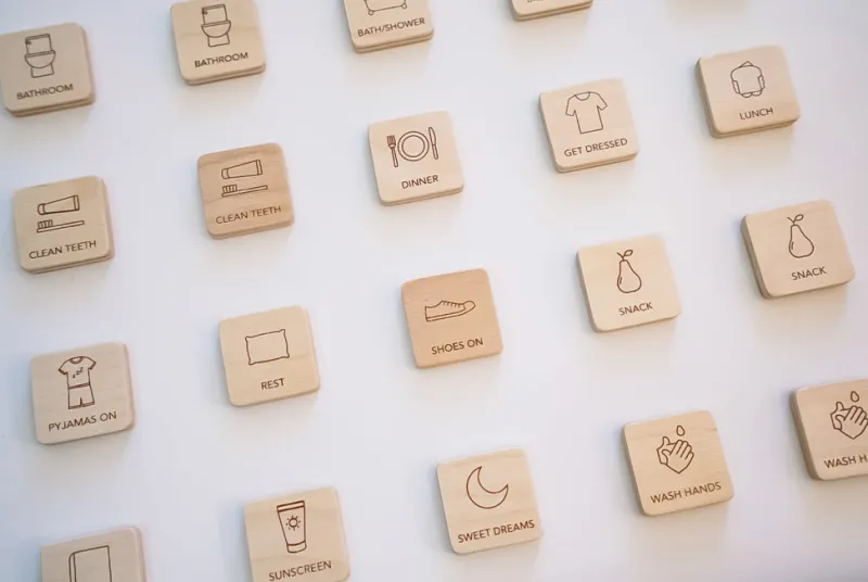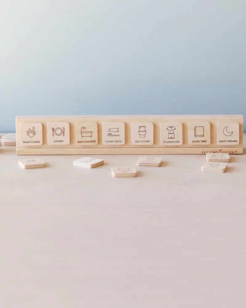 Afternoon/night tiles – rest, snack, wash hands, dinner, bath/shower, pyjamas, clean teeth, bathroom, story time, sweet dreams