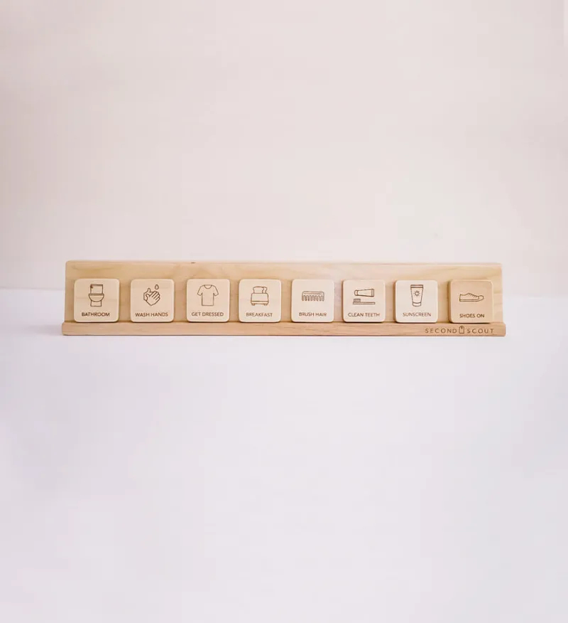 Morning tiles – breakfast, bathroom, clean teeth, get dressed, brush hair, sunscreen, shoes on, snack, wash hands, lunch