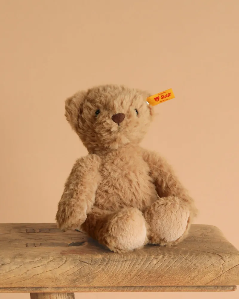 Our brown 8-inch Thommy Teddy bear is a classically styled bear that is impossible not to hug. With his luxuriously soft coat, your child will want to hold him in their arms forever. But when you do have to put him aside (if only for a moment), he sits upright, thanks to the little bean bags sewn inside. Thommy is made from silky soft caramel-colored plush, has an embroidered mouth, and a cute dark brown nose. And of course, he wears the famous Steiff quality trademark: the stainless steel button in ear.