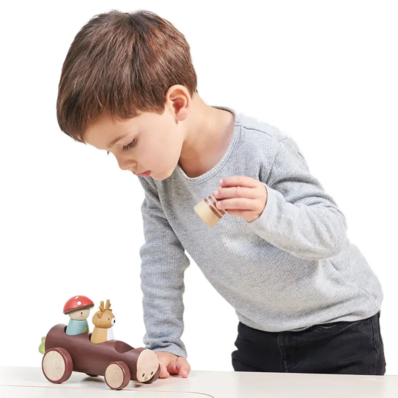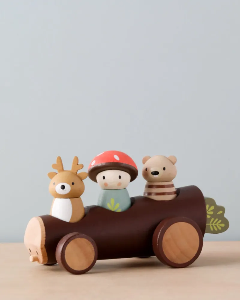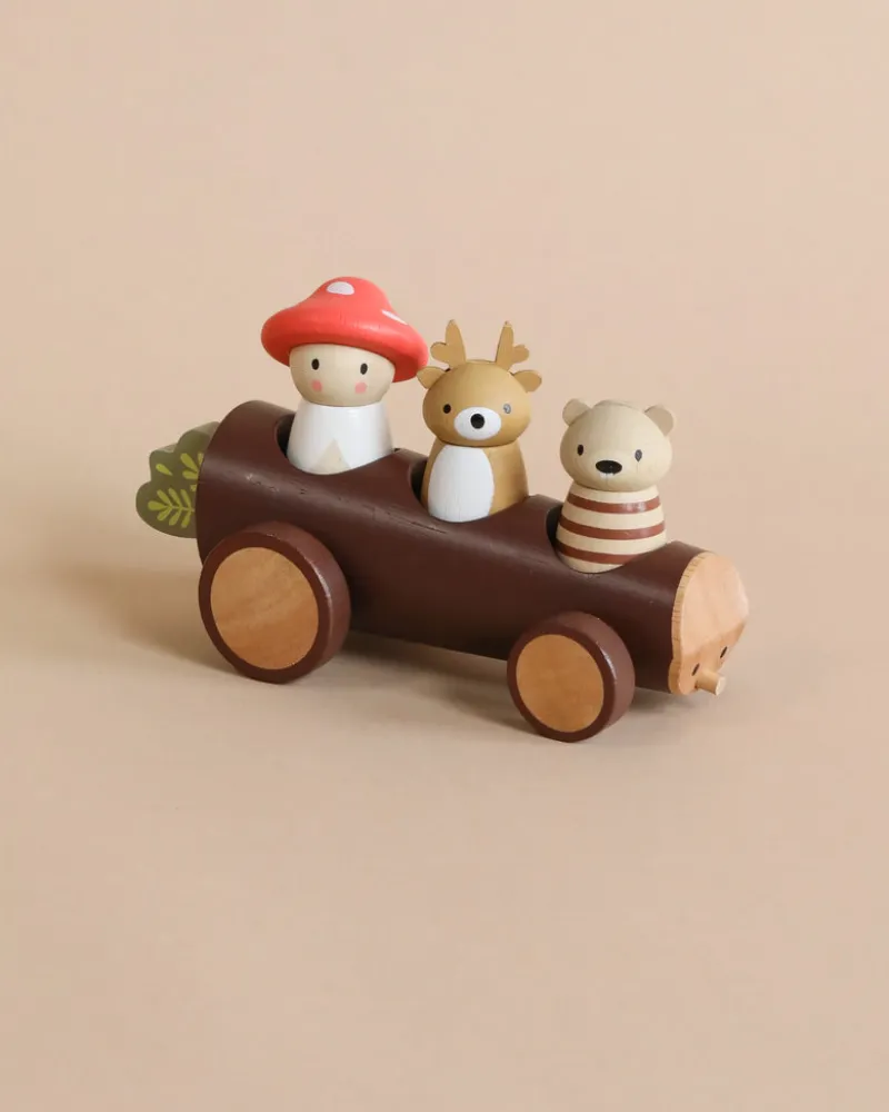 Call a taxi! Get around in style and pick up the Merrywood folks in this quirky log-shaped vehicle. Grabbing a ride today is Fungi, Robbie, and Woody.