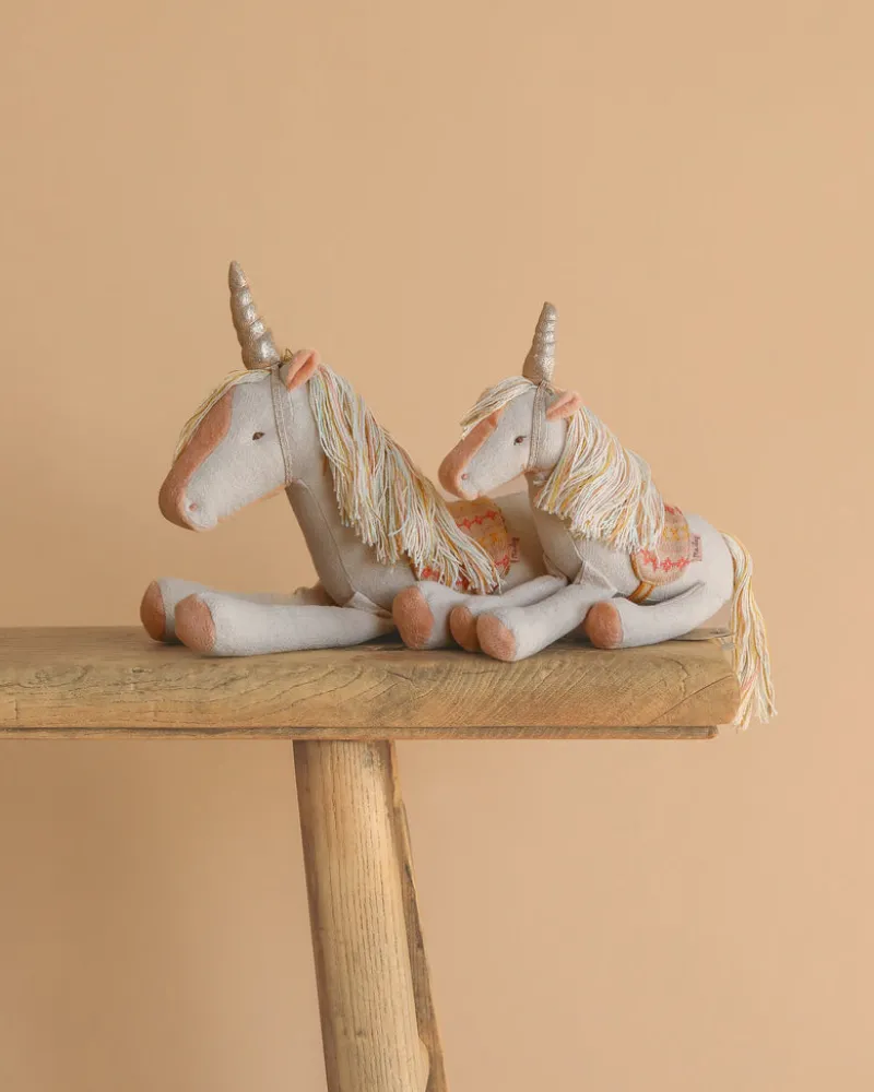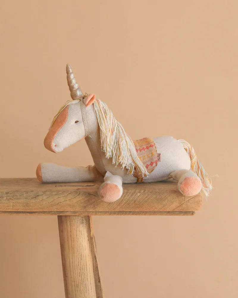 A magical story is about to begin. With this unicorn made in colourful tones and a golden horn, there are many stories to tell. The unicorn comes with a saddle for a comfortable ride. Fabric may vary.