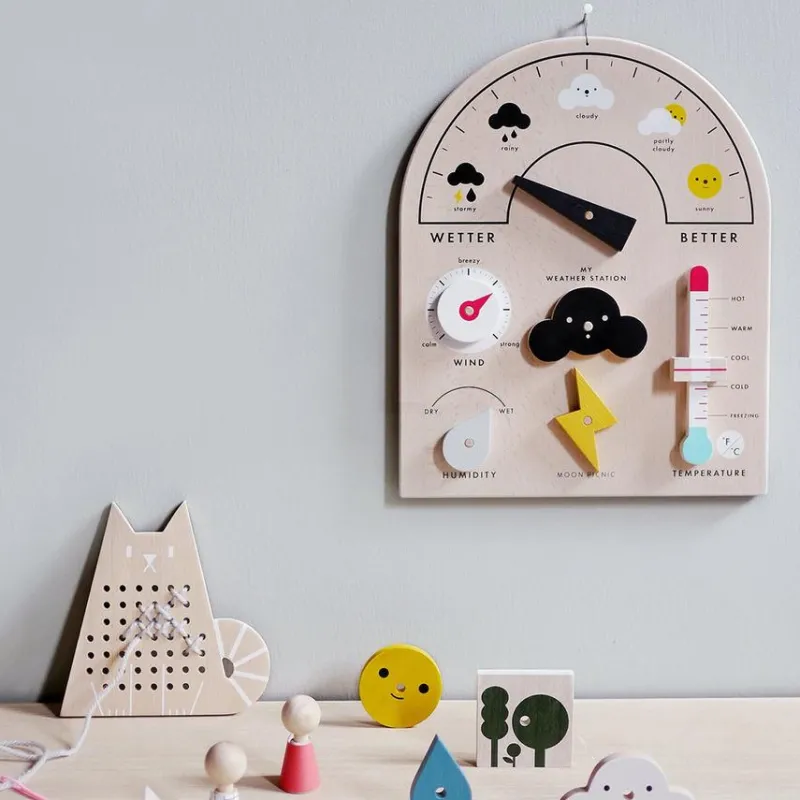 This fun & educational interactive toy has 4 movable parts and 5 weather symbols to display so little meteorologists can report and forecast the weather.