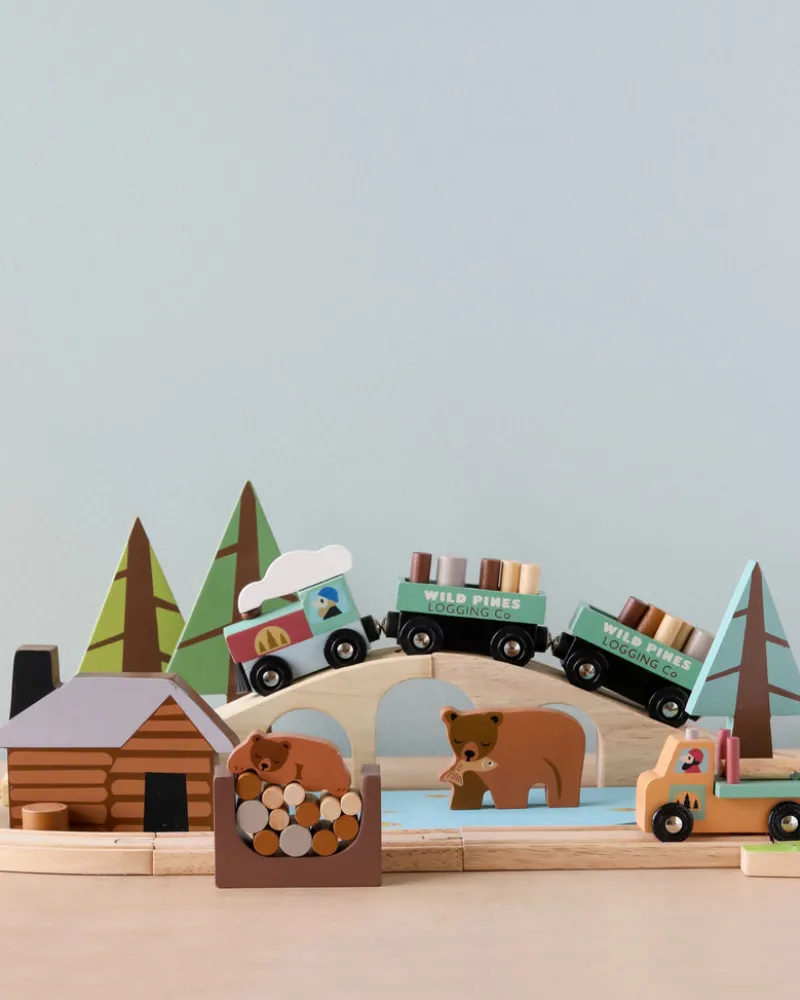 Included in this lumberjack style set is a log pile to hold the logs with a sleeping bear, a lake with 2 magnetized boulders and big bear, and a part that has 3 big fir trees that will block the track unless they are rotated out of the way! 4 cut timber logs and a tree nursery with