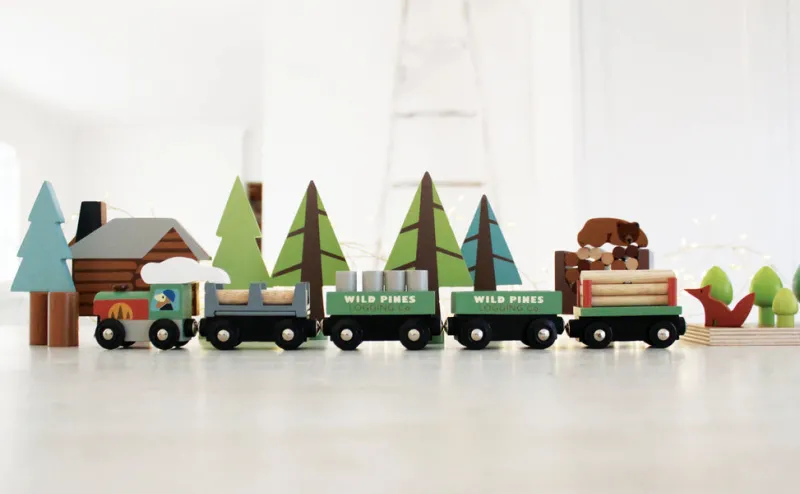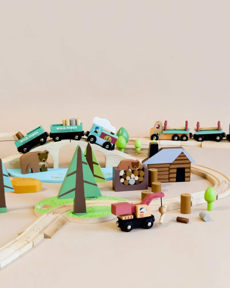 Accessories that move include an engine and 3 carriages holding 27 small logs of various colors.