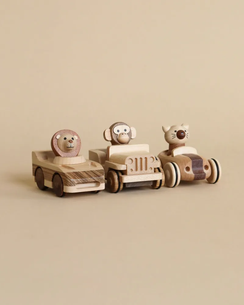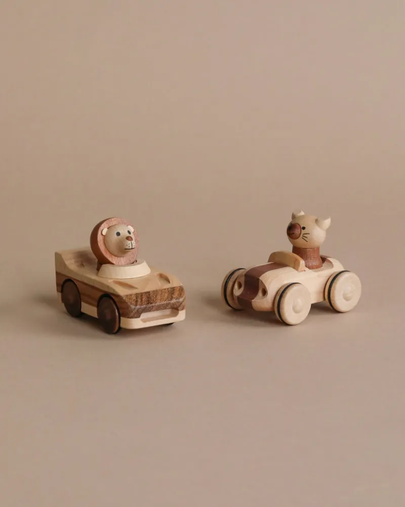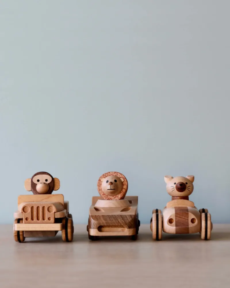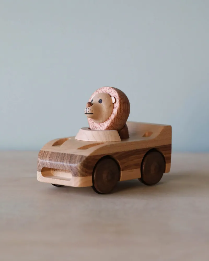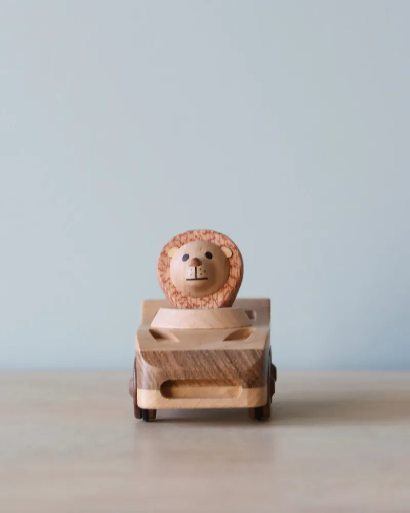 Made of solid wood with a pull back feature. The animal is not removable. Available in three different designs.