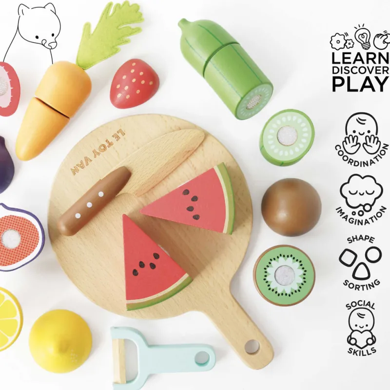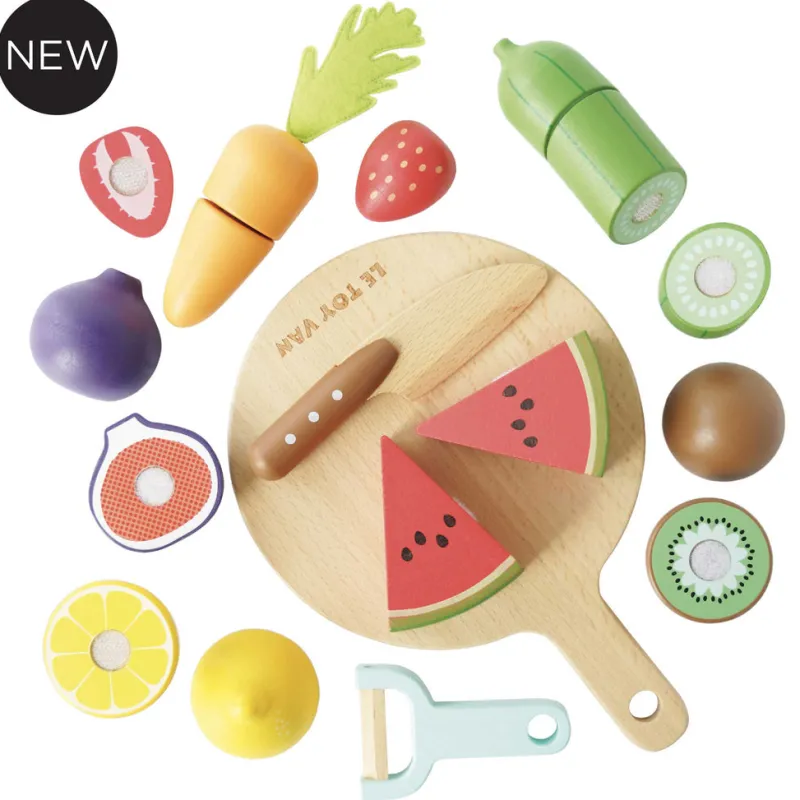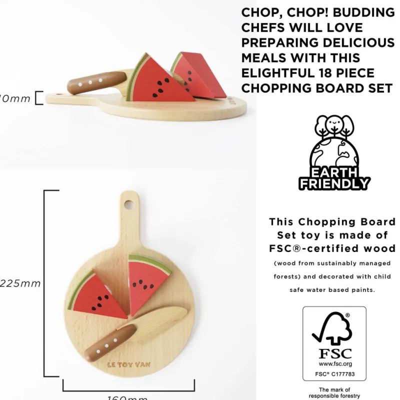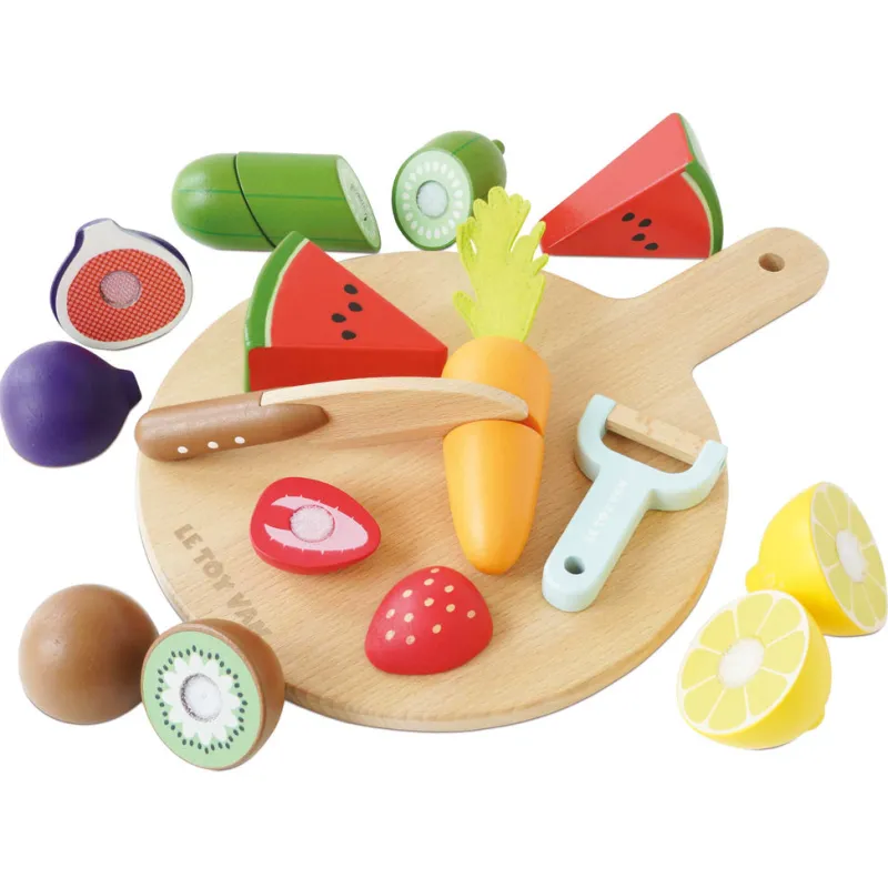 Chop, chop! Budding chefs will love preparing delicious meals with this delightful 18-piece chopping board set, a lovely addition to role play scenarios. Comprising a natural wooden chopping board, peeler, knife plus a selection of tasty looking fruit and veggies that can be ‘chopped up’ using the clever Velcro detailing. A great gift to encourage social skills, improve dexterity and fine motor skills.