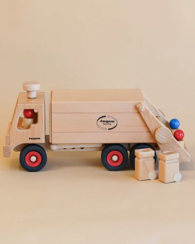 Kids can have fun with this Fagus Wooden Garbage Truck, featuring two removable bins that can be filled and tipped into the truck’s cargo space. Inside is a pair of peg figures, which can be removed for imaginative play. The sturdy structure and real rubber tires make it resistant to wear and tear from driving and construction activities. The wooden toys are handcrafted in a workshop for the disabled using beechwood, with interlocking, doweled, and glued connections. No nails, screws, or staples are used.