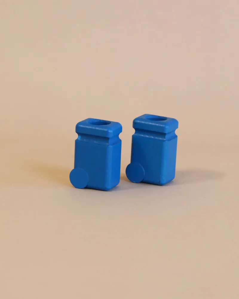 A set of two garbage cans in blue for the Fagus Garbage Truck.