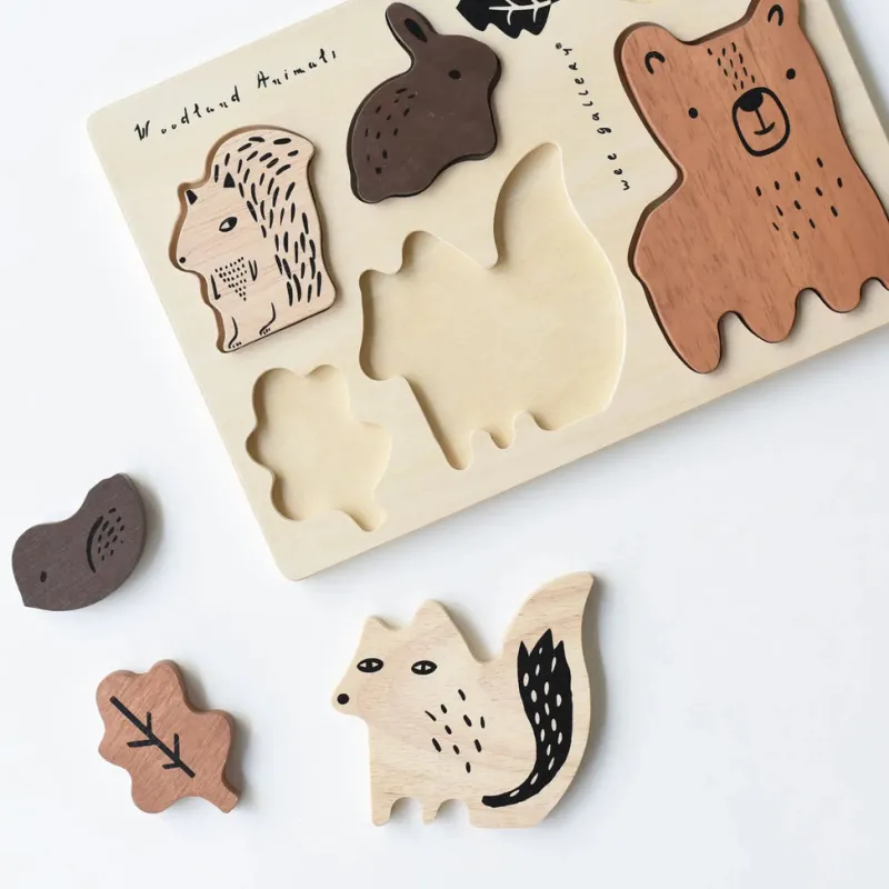 This beautiful six piece Wooden Puzzle is perfect for so many kinds of play! Solving the tray puzzle is just the beginning. You can also use the adorable wooden animals as play time characters in this themed Woodland set. For more educational fun, teach your child to recognize and find each creature in the artwork on the back of each puzzle tray.