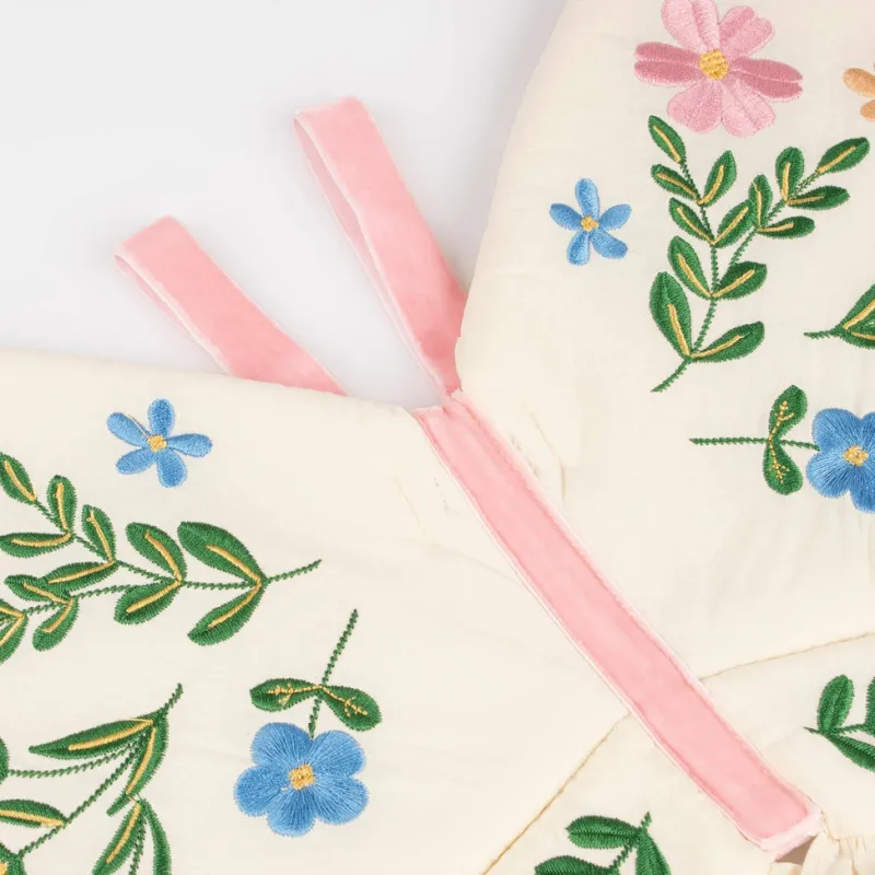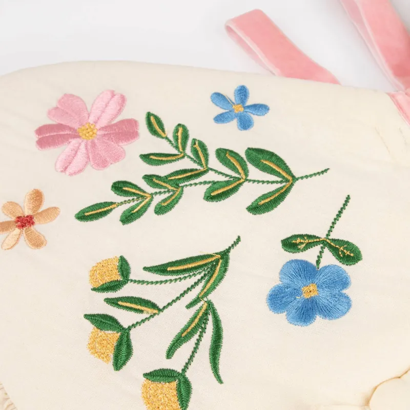 - Embroidered flowers in blue, green, gold, yellow, pink and peach