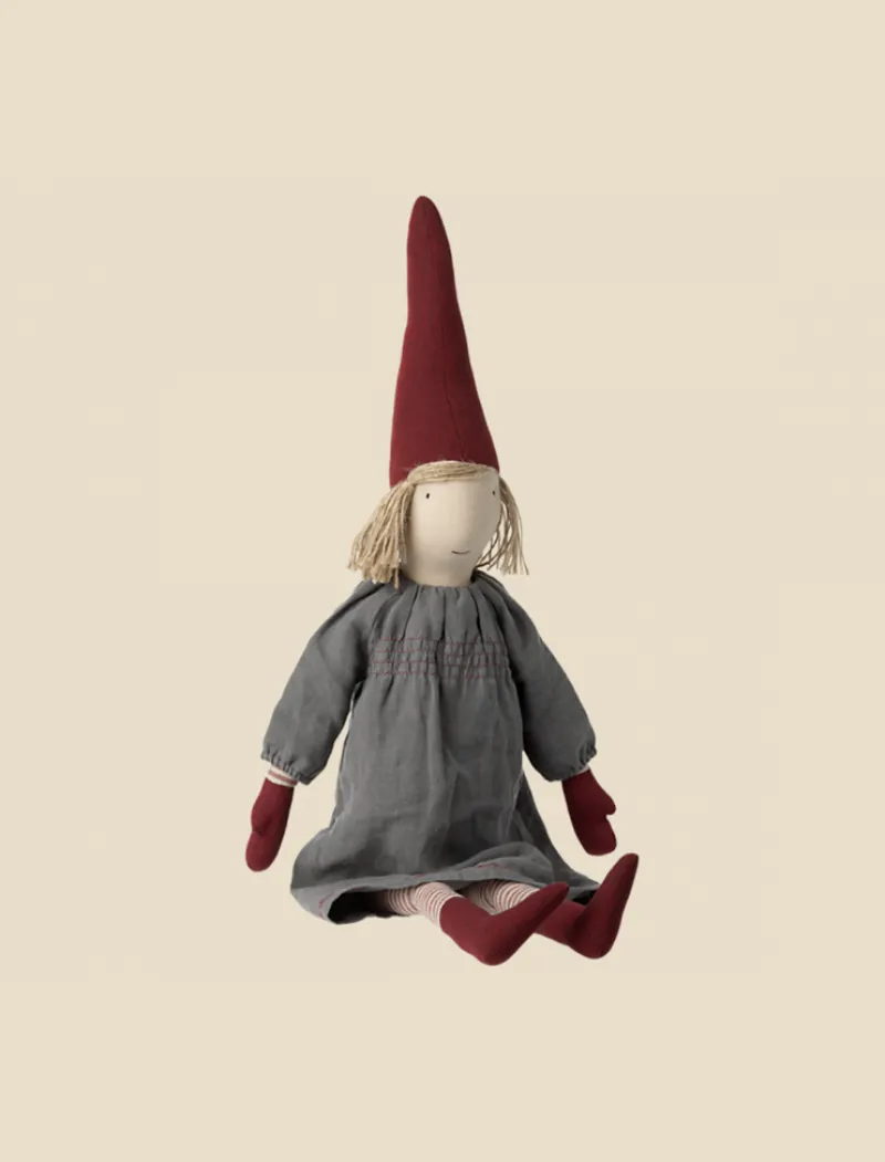 This pixy in size small is wearing beautiful clothing.