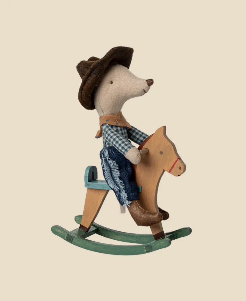 A fantastic set for hours of play. A cowboy mouse with magnets in his hands, dressed in jeans, a scarf, and a cowboy hat, rides on his rocking horse. Notice the small tail hole on the horse—a detail for the observant consumer.