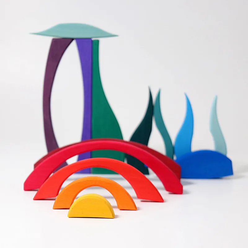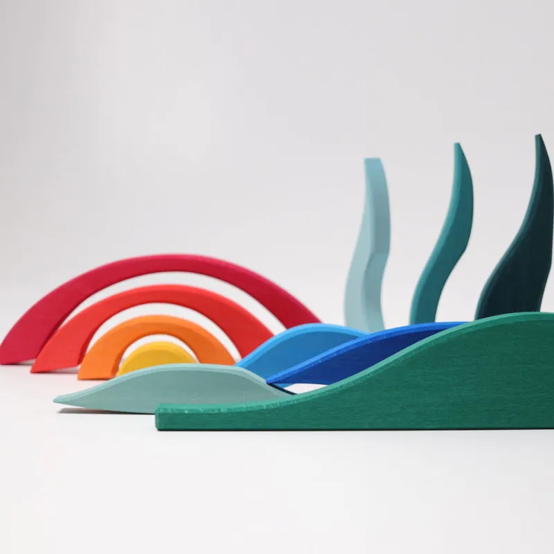 The organic, curved shapes inspire children to develop fine motor skills and spatial thinking skills through block play.