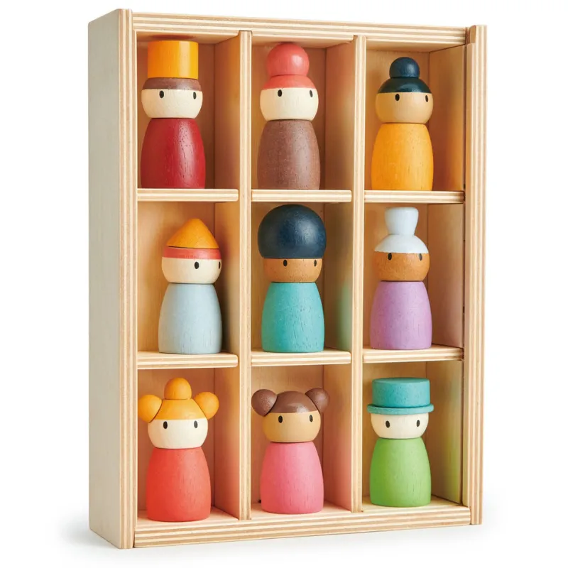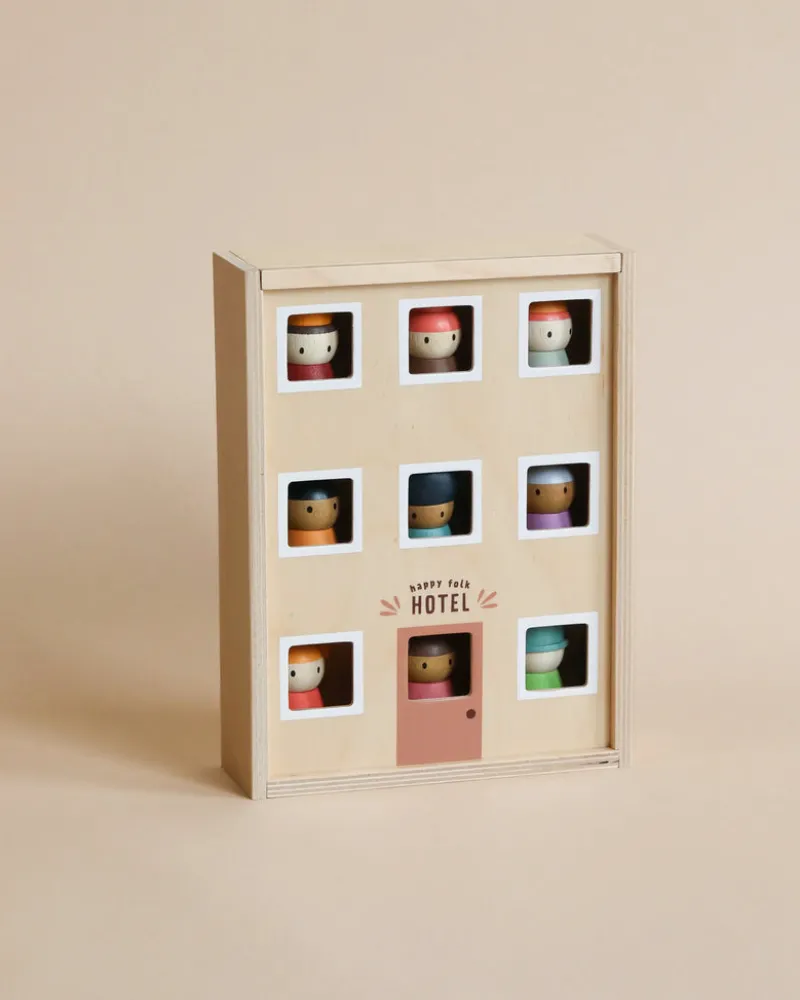 Part of our open-ended play, meet the 9 folks who reside at the happy hotel. Made from solid wood, colored with a soft water based stain, they can represent anyone you know. These little people are perfect for adding to any sort of creative or imaginative play, and can be perched easily on any surface.
