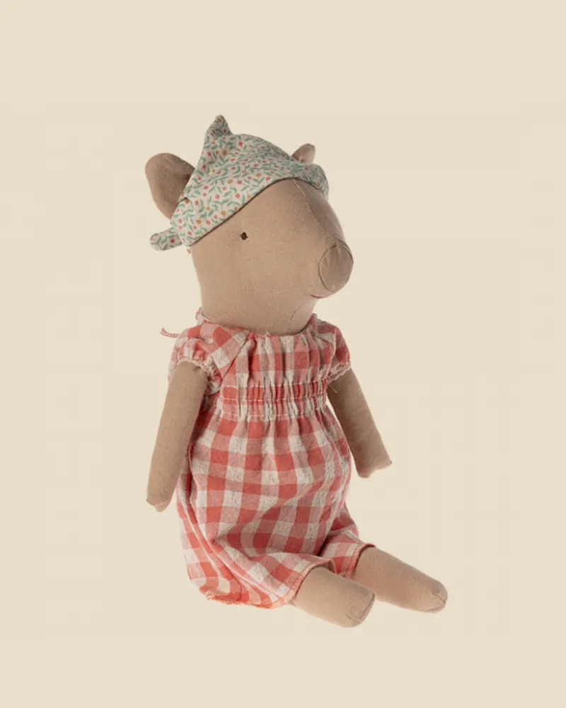 Oink Oink – say hello to the sweetest pig. This pig come in a beautiful dress and scarf and can sit on its own. Create your own pig family by adding more family member from the collection.