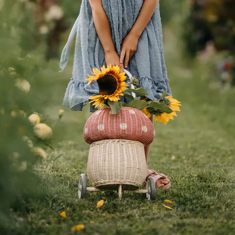 Meet the Olli Ella whimsical pink Mushroom Luggy. It exists in the world between practical and fairytale and is perfect for lugging about at home or on the go.
