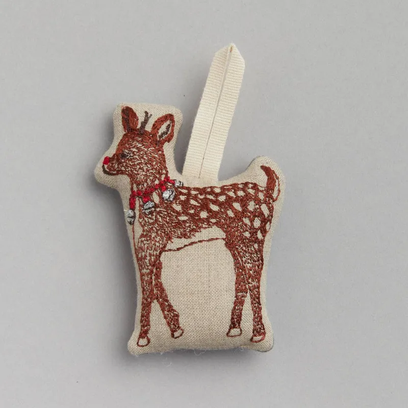With his glowing red nose, Rudolph leads the way to Christmas Day. Santa’s favorite reindeer wears a string of jingle bells embroidered with silver metallic threads. Rudolph will add a little sparkle to your tree.Measures 4″ x 3″ with a 2″ cotton loop for hanging.