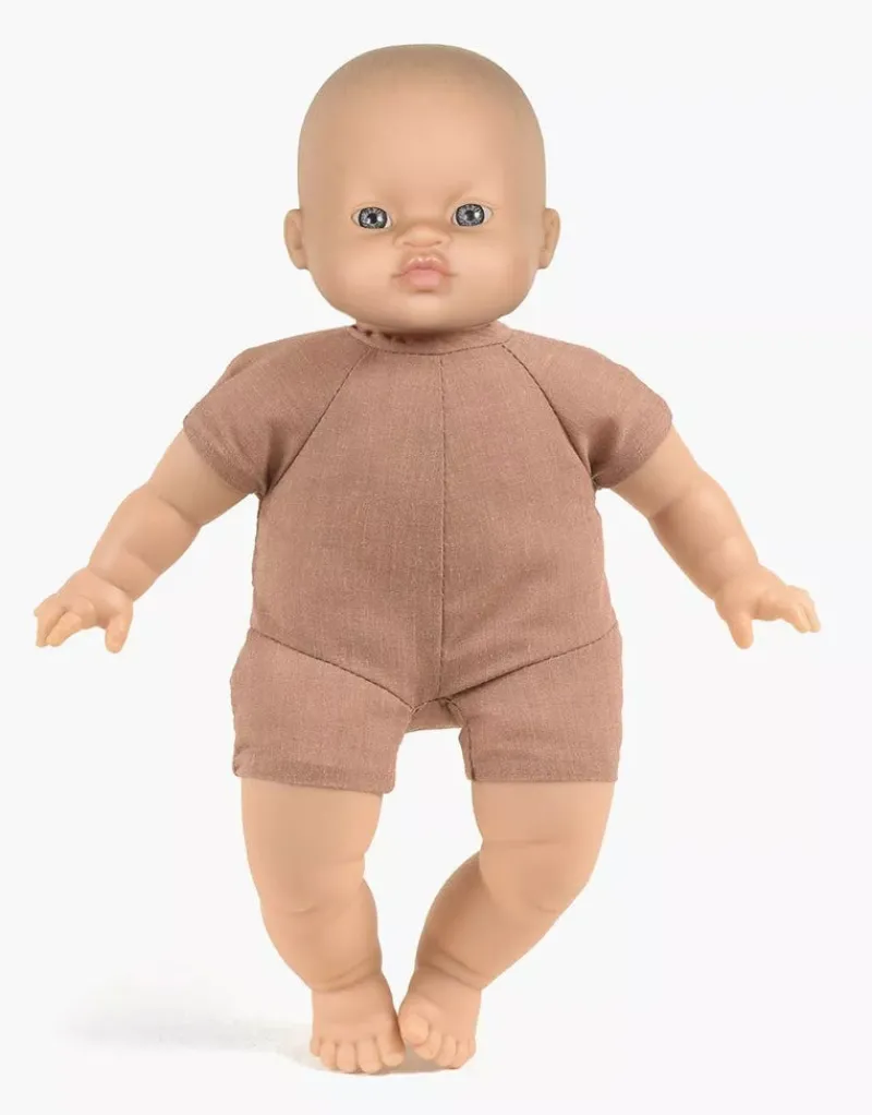 This adorable Minikane Soft Body Doll is crafted from soft cotton fabric and filling, with a subtle scent of vanilla. Its snuggly soft body makes it the perfect bedtime companion for children. The arms, legs, and head are made from safe, phthalate-free vinyl. Minikane dolls are stunning, top-quality treasures that will be loved by little ones for years to come. Add a charming Minikane doll bed, darling outfits, and accessories for even more imaginative playtime fun!