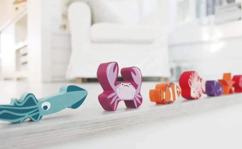 A wooden stacking under the sea rock with 18 wonderfully colored sea creatures including a shrimp, a squid, a crab, 2 eels, a sea urchin, a sea anemone, a starfish, a seahorse, 4 fish, four coral pieces, and a hermit crab.