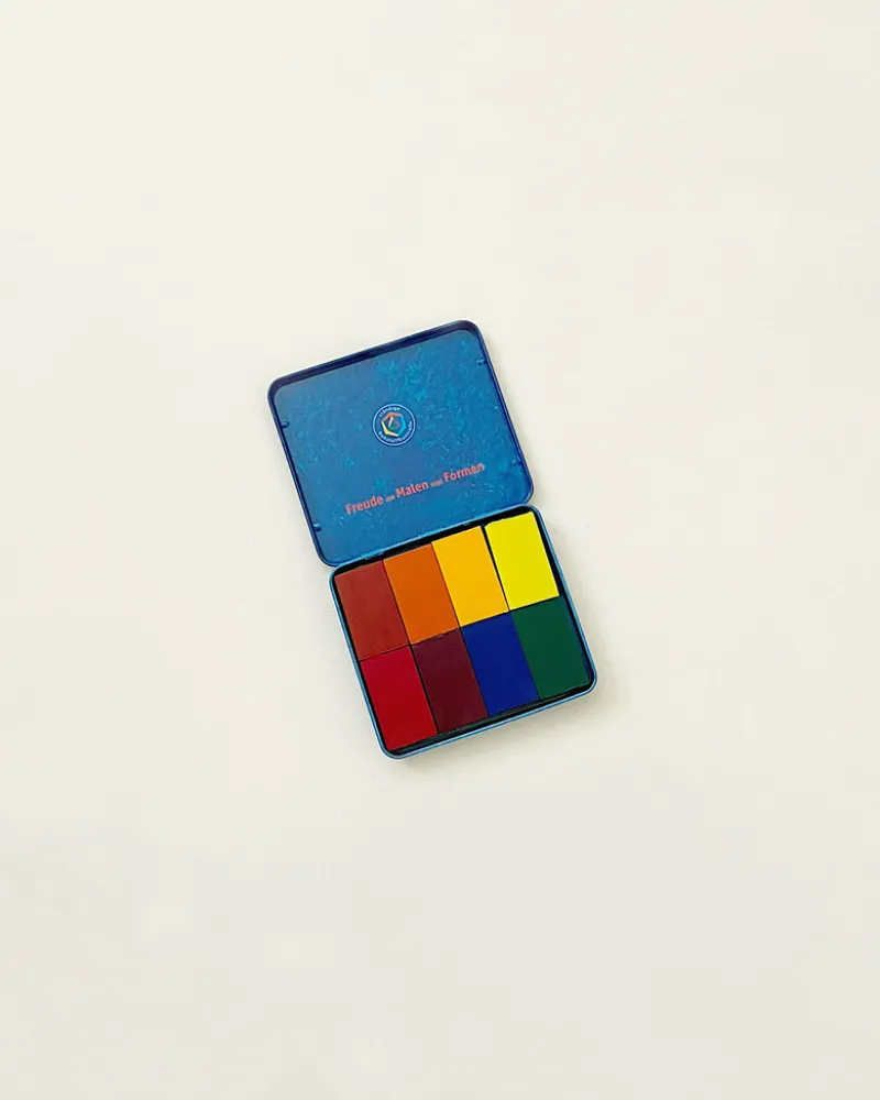 Tin case, 8 blocks each 1.61 x 0.91 x 0.47 inches (41x23x12 mm), with scrapers, 8 assorted Waldorf colors